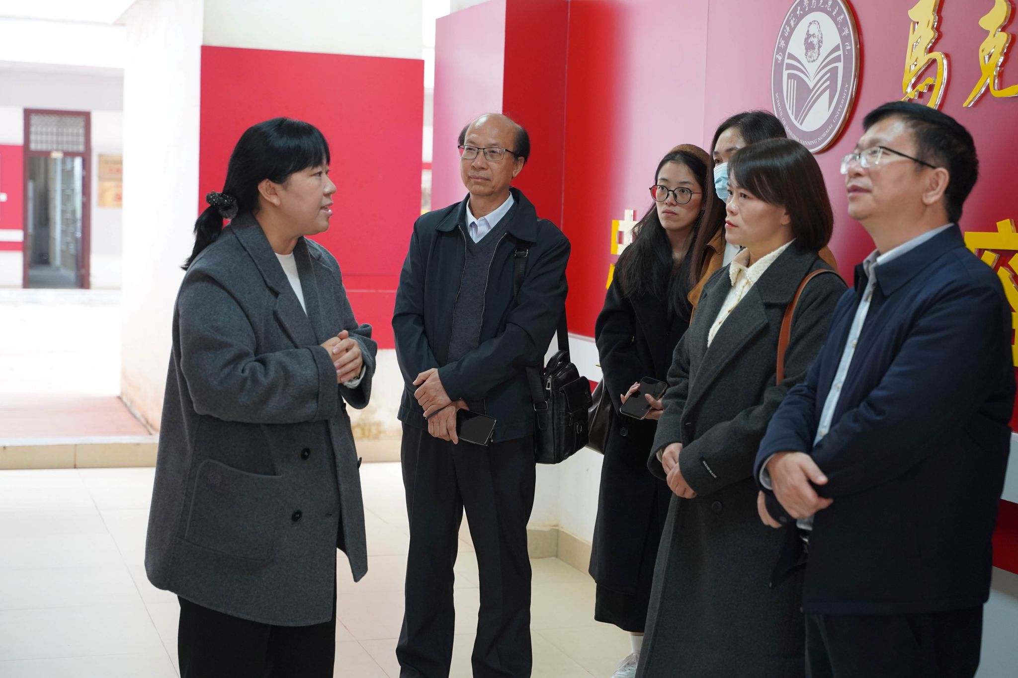 罗必本一行首先实地走访马克思主义学院党史育人画廊、科学社会主义发展史教育馆、马克思主义理论教育广场、虚拟仿真实验室等阵地。在交流会上,双方聚焦党建工作、思政专业建设、大中小学思政课一体化建设、铸牢中华民族共同体意识教育及新入职教师培养等问题深入探讨、各抒己见。