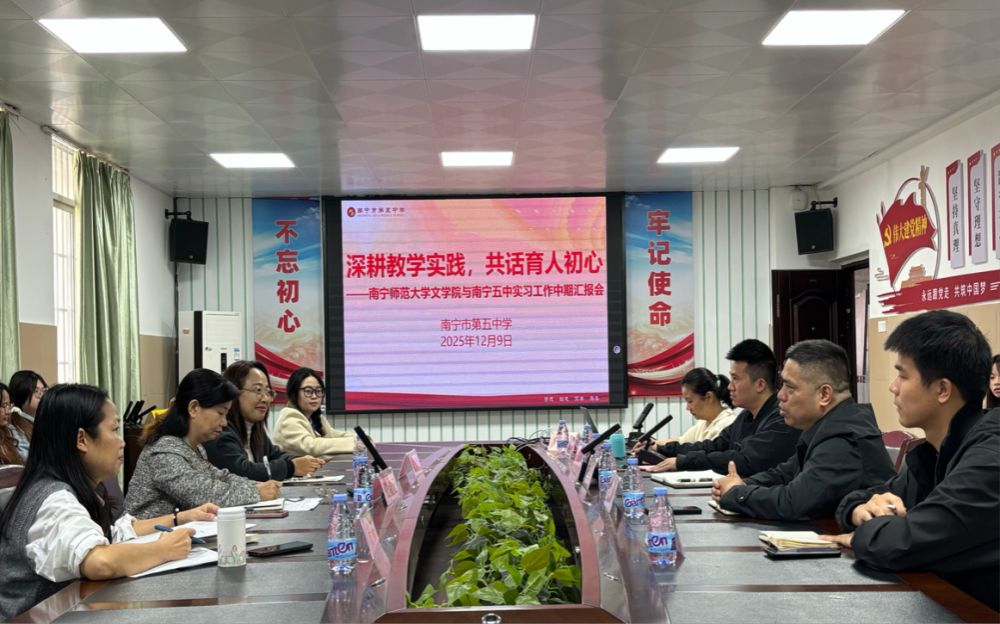 2025年12月5日,KY开元集团官网文学院与南宁市第五中实习工作中期汇报会在南宁五中图书馆六楼会议室举行,由南宁五中教务处莫庆信副主任主持。五中校长蒋振恩、副校长陈耀康、指导教师代表,文学院副院长张淑云、实习带队教师、实习学生齐聚。