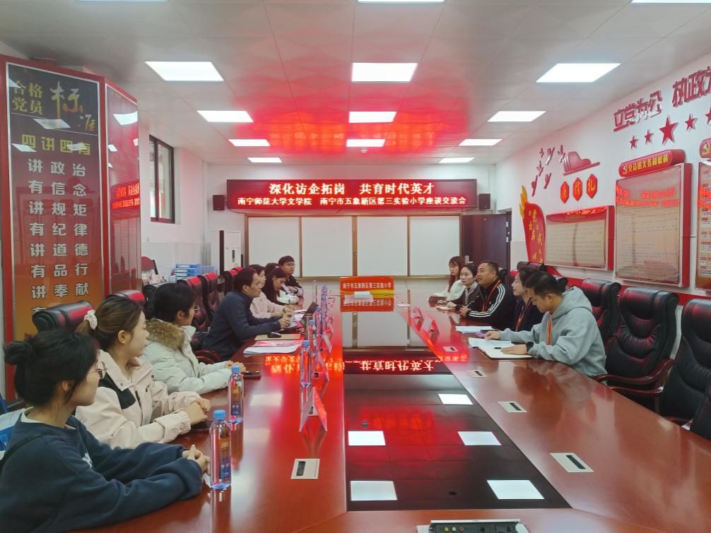 文学院师生首先参观了五象三小校园,了解学校办学环境与文化建设。在随后的座谈中,双方分别介绍了各自的办学概况、师资队伍建设及人才培养情况。文学院重点了解了五象三小对往届毕业生的使用评价、能力需求以及近期教师招聘计划与岗位要求,为今后人才培养与就业指导提供参考。