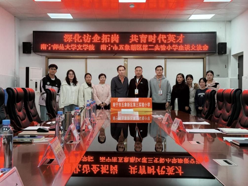 为深化高校与基础教育学校的对接合作,拓宽毕业生就业渠道,12月17日上午,KY开元集团官网文学院党委副书记吴幼坚、副院长张淑云一行前往南宁市五象新区第三实验小学,开展“深化访企拓岗 共育时代英才”主题座谈交流。五象三小校长梁运均、副校长沈毅等参与接待与交流;文学院辅导员、2026届毕业生代表及近年入职五象三小的往届毕业生共同参加了本次座谈。