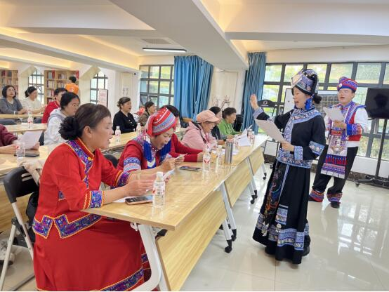 最受居民欢迎的是普法山歌教唱环节。协会成员带领居民学唱原创普法山歌,将法律知识融入朗朗上口的旋律中,歌词直白朴实、贴合生活,既保留了民族文化特色,又传递了法治理念。协会成员耐心指导,帮助居民掌握法律技能;社区居民积极参与,跟着节奏齐声合唱,在轻松愉悦的氛围中加深了对法律知识的记忆与理解,现场歌声阵阵、互动热烈。