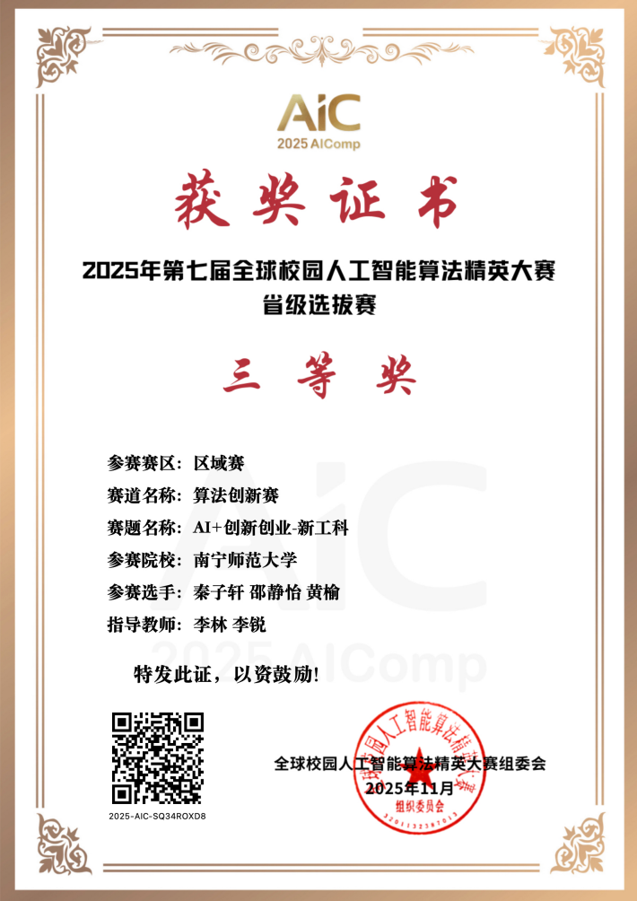 此外,在近期举办的第七届全球校园人工智能算法精英大赛(AIC,A类竞赛)中,肖力惠等同学表现优异,在省级选拔赛中分别获得二等奖和三等奖,并成功晋级全国总决赛,最终荣获国家级优秀奖。