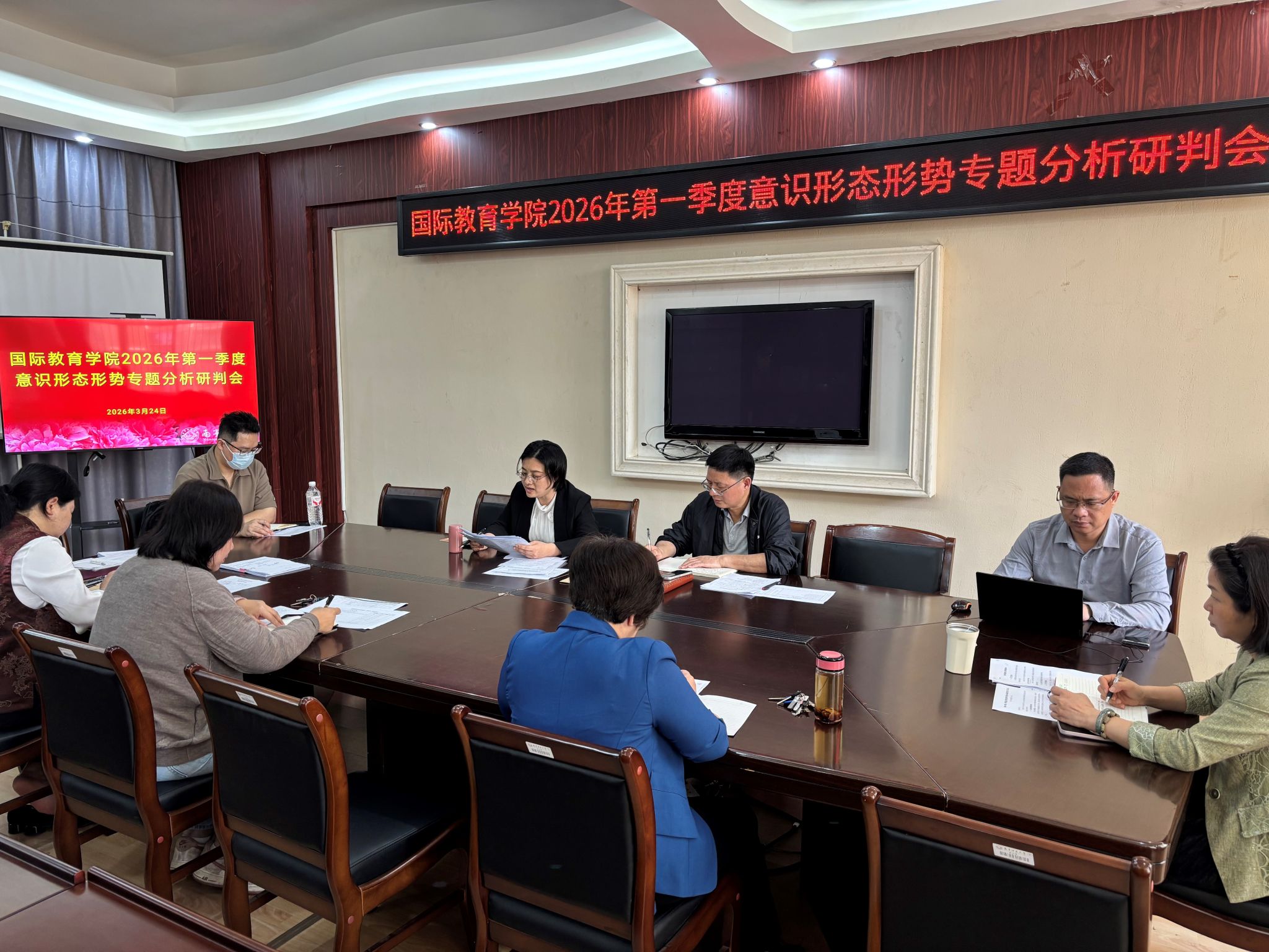 3月24日上午,国际教育学院在外语楼310会议室召开学院2026年第一季度意识形态形势专题分析研判会。会议由学院党委书记旷晓霞主持,学院全体领导班子成员参加会议。
