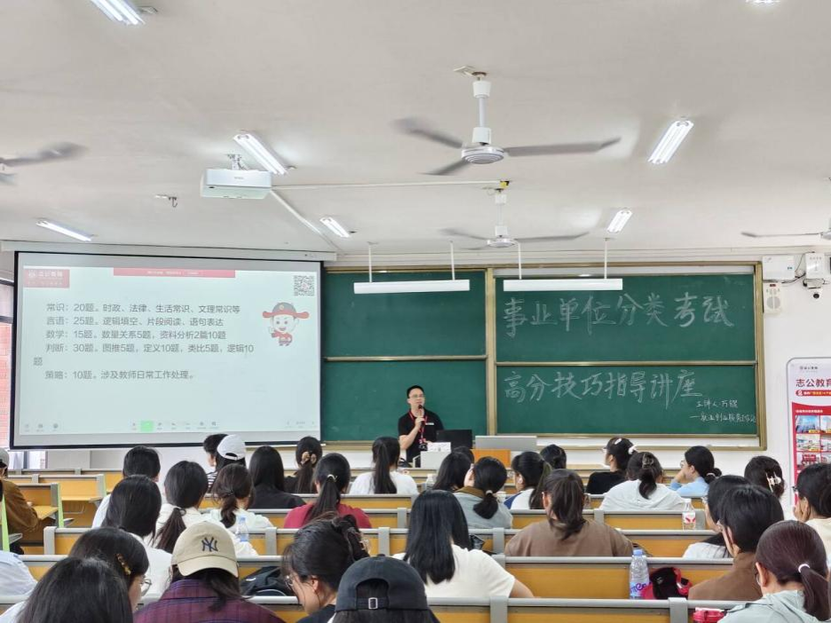 为助力2022级应届毕业生备战事业单位考试,提升职业能力测验应试水平,3月25日下午,学校在实验2A-301教室顺利举办事业单位分类考试高分技巧指导讲座。本次讲座由学生就业中心主办,数学与统计学院承办,讲座特邀志公教育学科带头人万琨老师主讲,数统学院辅导员滕容梅老师到场主持,武鸣校区毕业生到场学习。