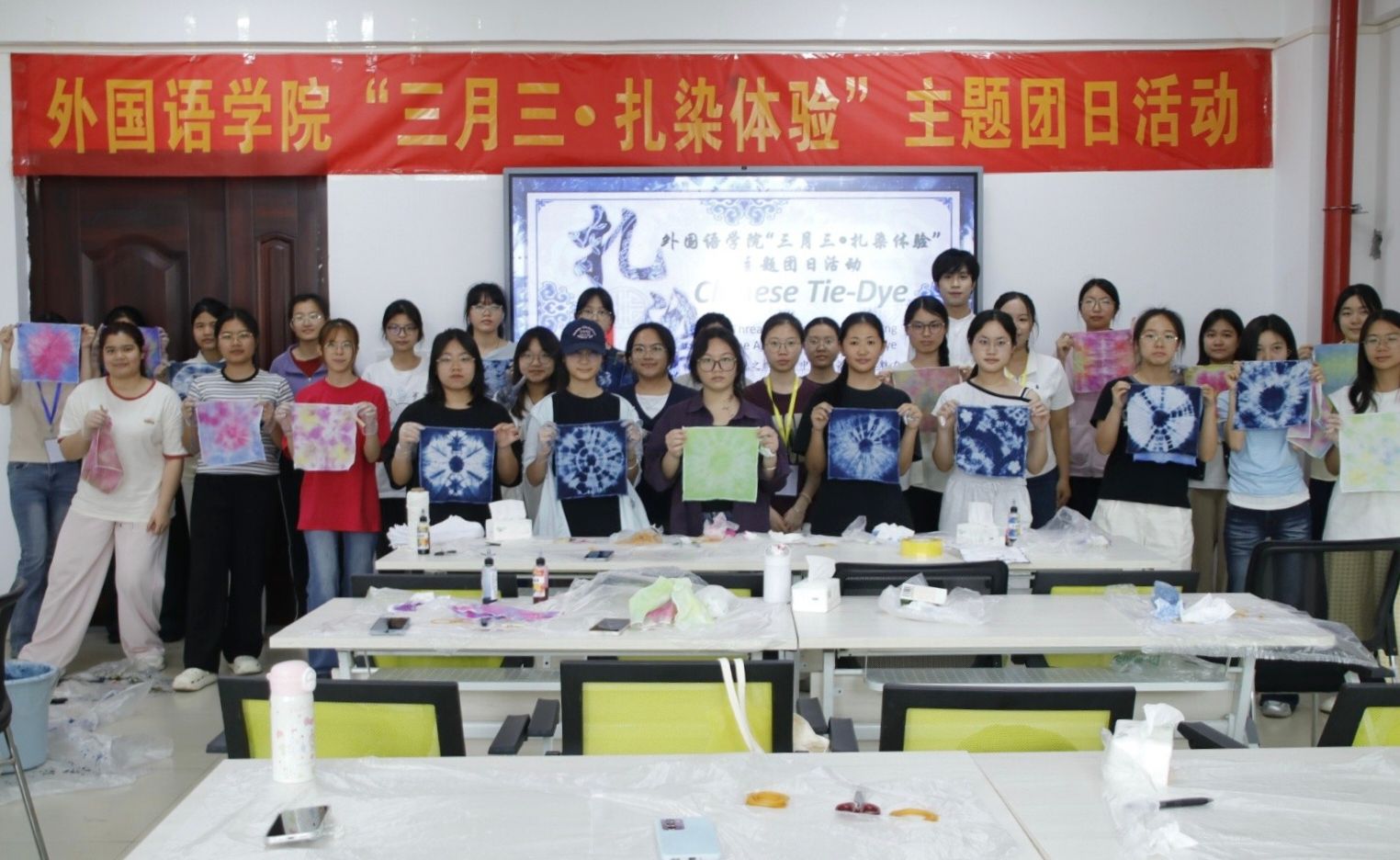 随后,活动进入扎染体验环节。主持人结合现场演示,用英文讲解了扎染工艺中的扎结、染色、晾干三大流程,接着在工作人员的组织下,同学们亲自动手体验,完成各道工序。大家充分发挥创意,制作出独具特色的扎染方巾,现场气氛热烈,作品异彩纷呈。