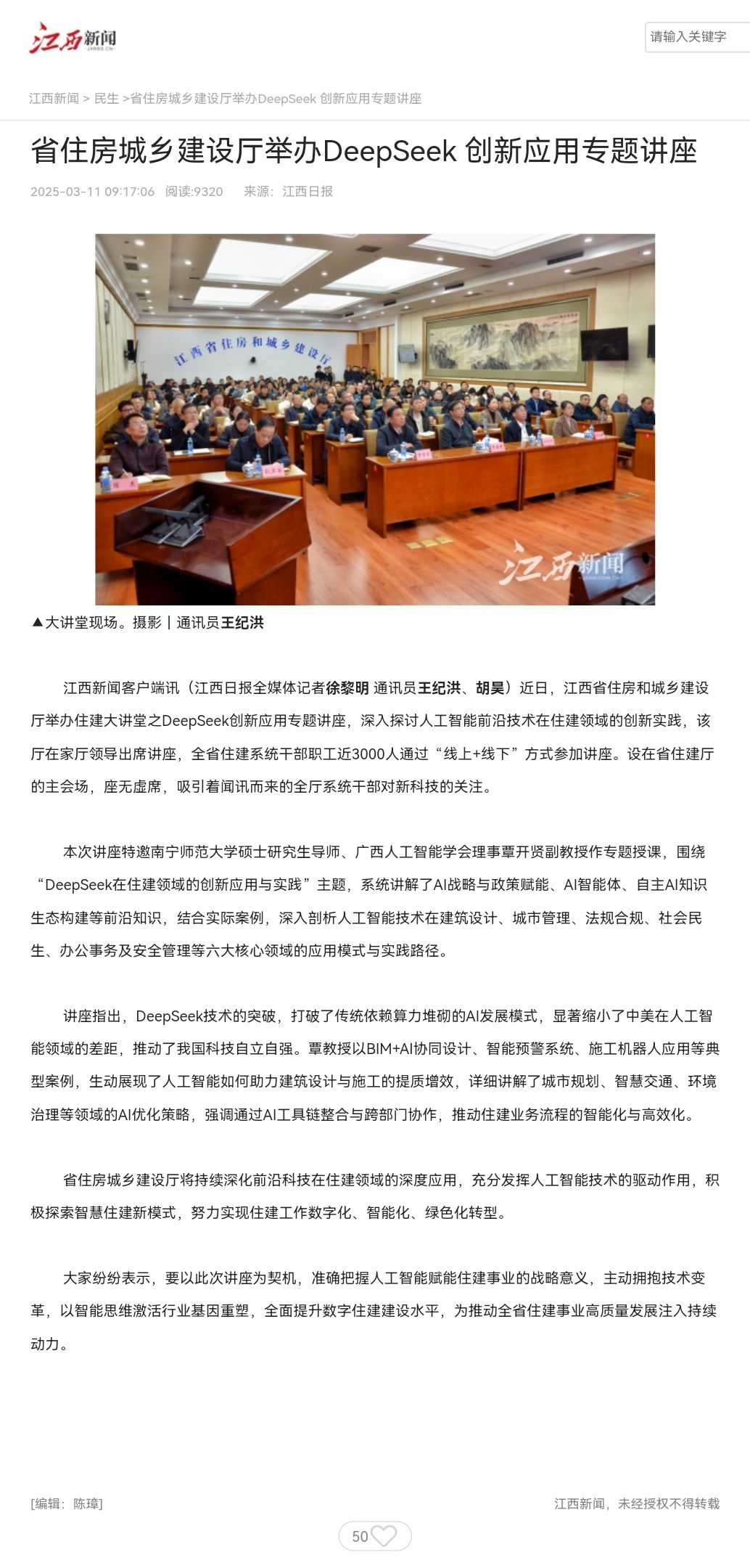 【江西日报】省住房城乡建设厅举办DeepSeek创新应用专题讲座