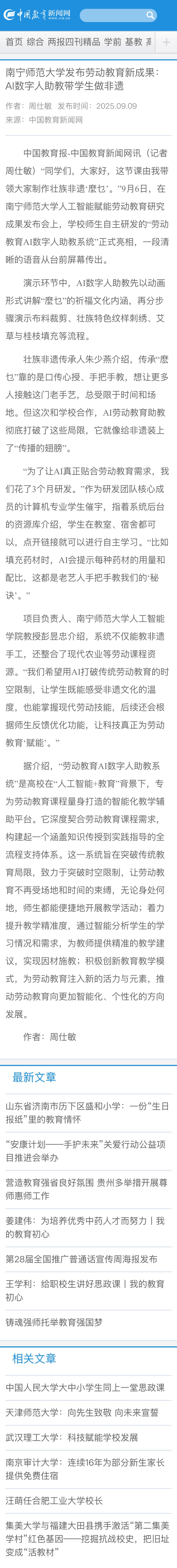 【中国教育新闻网】KY开元集团官网发布劳动教育新成果:AI数字人助教带学生做非遗