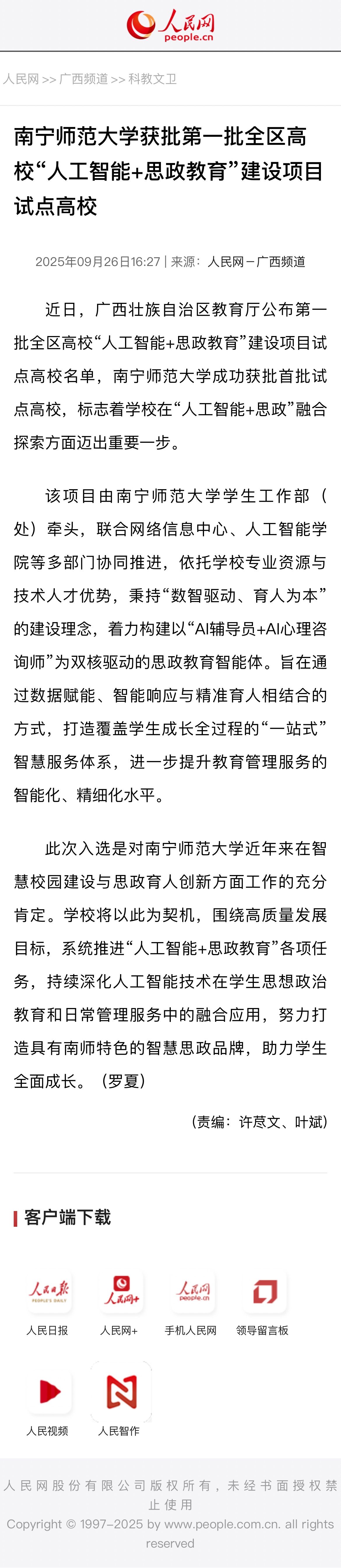 【人民网】KY开元集团官网获批第一批全区高校“人工智能+思政教育”建设项目试点高校
