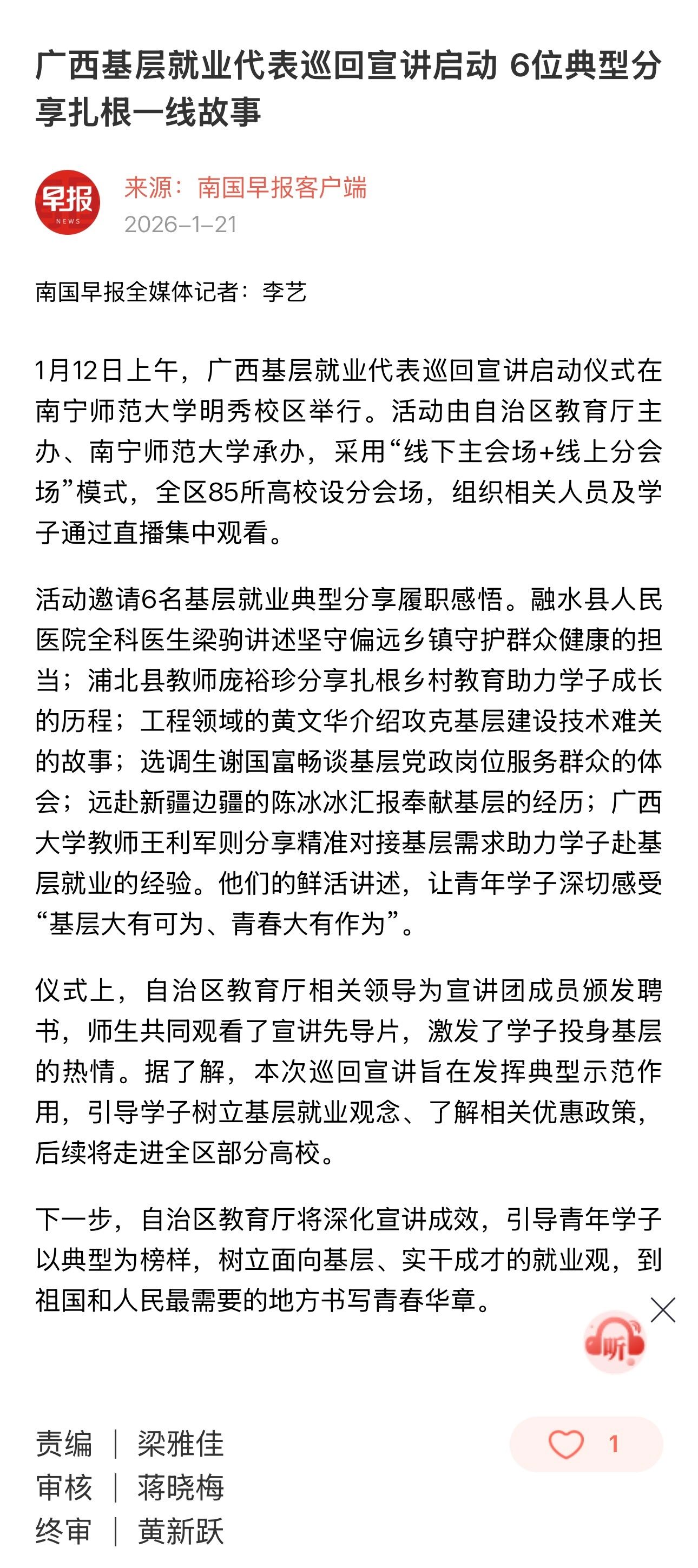 【南国早报客户端】广西基层就业代表巡回宣讲启动 6位典型分享扎根一线故事