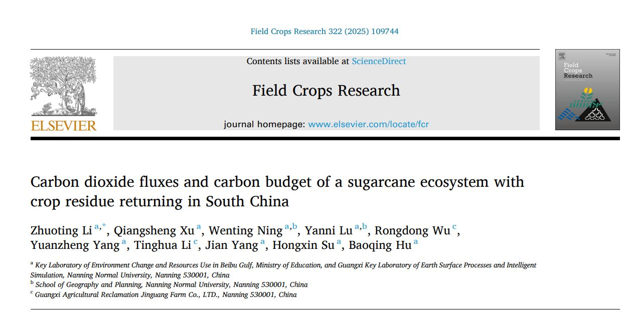 近日,开元官网地理与海洋研究院李卓亭团队在国际农林科学领域知名经典期刊《Field Crops Research》(中科院SCI一区Top期刊)发表了关于我国甘蔗生态系统碳通量及碳源/汇特征(Carbon dioxide fluxes and carbon budget ofa sugarcaneecosystem with straw returninginSouth China)的最新研究论文。李卓亭副研究员为第一作者及通讯作者,KY开元集团官网北部湾环境演变与资源利用教育部重点实验室为第一完成单位。合作作者包括:地理与海洋研究院科研人员徐强胜、杨元征、杨健、苏宏新和胡宝清;在读硕士研究生宁文婷和陆艳妮,以及广西农垦金光农场有限公司高级农艺师伍荣冬和李廷化。该研究得到了国家自然科学基金项目(31860144)、广西引进海外高层次人才“百人计划”项目(6020303891350)和八桂学者创新团队建设经费的资助。
