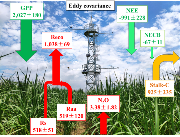 该研究依托由地理与海洋研究院主建的广西金光农田生态系统野外科学观测研究站(该站已入选全国生态质量综合监测站网),利用涡动相关和静态箱观测土壤呼吸相结合的方法,首次报道了我国甘蔗生态系统CO2通量及其组分(NEE、Reco和GPP)的季节和年际变化特征;解析了其关键影响因子;量化分析了甘蔗生态系统碳收支平衡特征,研究结果可为甘蔗生态系统绿色低碳发展提供科学支撑。