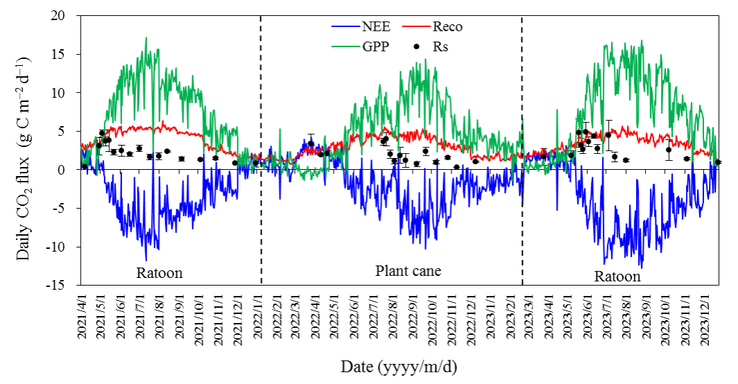 2021 - 2023年甘蔗生长季日净生态系统二氧化碳交换(NEE)、生态系统呼吸(Reco)、总初级生产力(GPP)和土壤呼吸(Rs)的动态特征