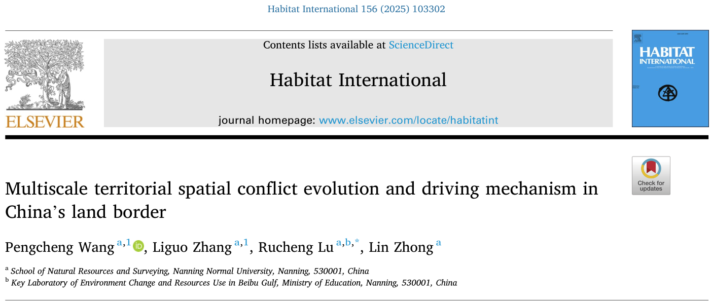 研究团队在Habitat International(中科院一区TOP,SSCI-Q1)发表了题为“Multiscale territorial spatial conflict evolution and driving mechanism in China’s land border”的研究论文。文章构建空间冲突测度模型,采用转移强度图谱、空间计量模型、最优参数地理探测器揭示边境国土空间冲突的演化趋势与驱动机理,并提出边境空间冲突调控路径。该文由陆汝成教授为通讯作者,硕士研究生王鹏程、张利国博士作为共同第一作者完成。