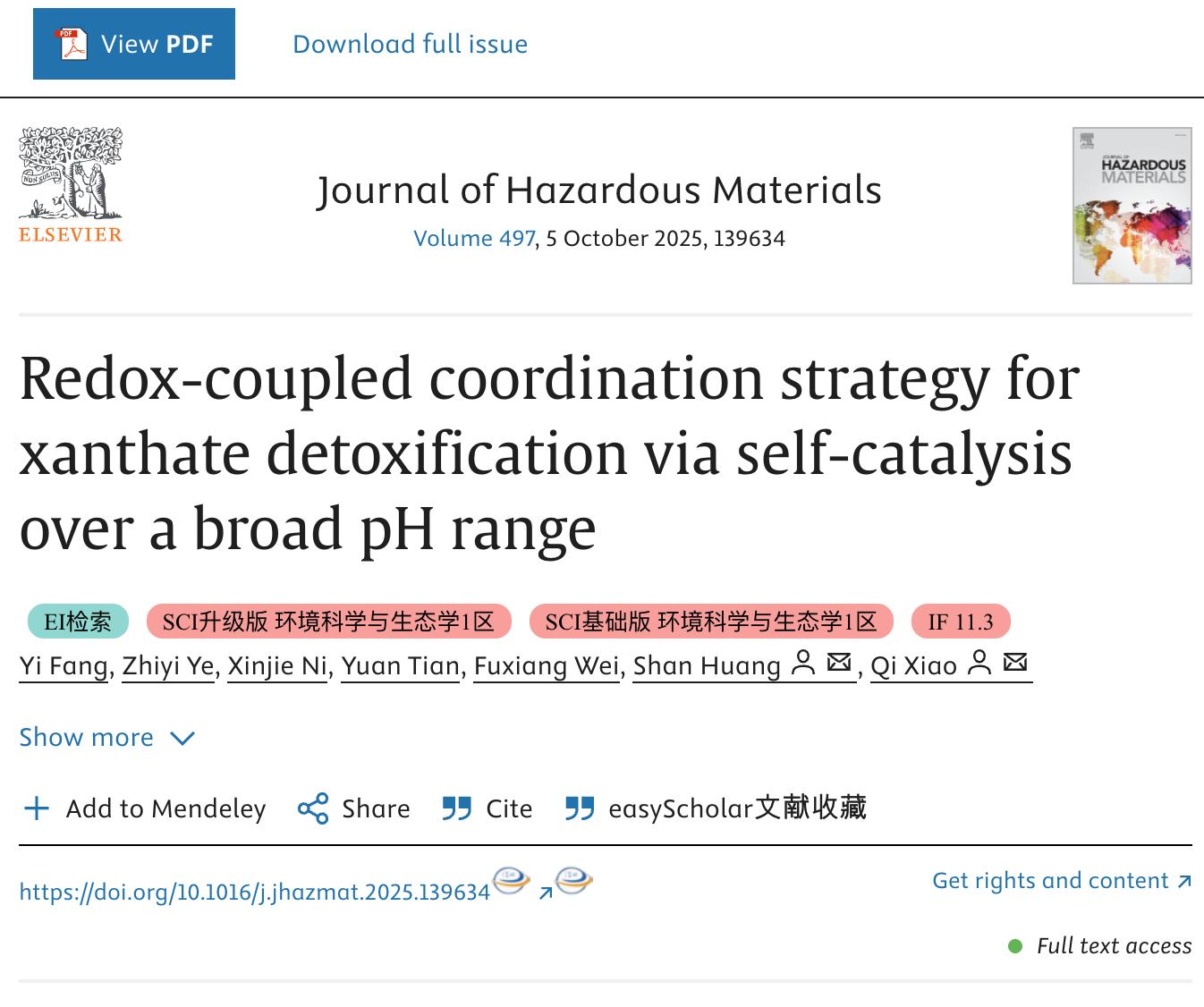 开元官网化学与材料学院研究团队在国际环境领域期刊《Journal of Hazardous Materials》(中科院一区Top,IF 11.3)上发表了题为“Redox-coupled coordination strategy for xanthate detoxification via self-catalysis over a broad pH range”的研究论文。该论文以KY开元集团官网为唯一完成单位,方义博士为第一作者,黄珊教授和肖琦教授为共同通讯作者,魏福祥博士参与部分研究。该研究成功开发了一种基于铜价态循环自催化的新技术,为宽pH条件下黄药类选矿药剂的高效降解与脱毒提供了新思路和新方法。
