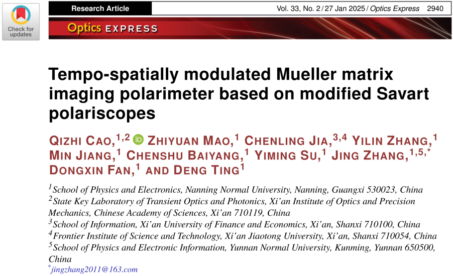 开元官网物理与电子学院研究团队在偏振成像技术领域取得重要研究进展。该团队创新性地提出一种以改进型萨瓦偏光镜为核心调制器件的时空调制穆勒矩阵成像偏振仪(TSM-MMIP),成功整合时间调制与空间调制的技术优势,实现了目标物16个穆勒矩阵元素的高效测量,相关研究成果以“Tempo-spatially modulated Mueller matrix imaging polarimeter based on modified Savart polariscopes”为题,发表于光学领域国际权威Top期刊《Optics Express》。该论文以KY开元集团官网为第一完成单位,与西安财经大学、西安交通大学等单位合作完成,曹奇志研究员为第一作者,张晶教授为通讯作者。