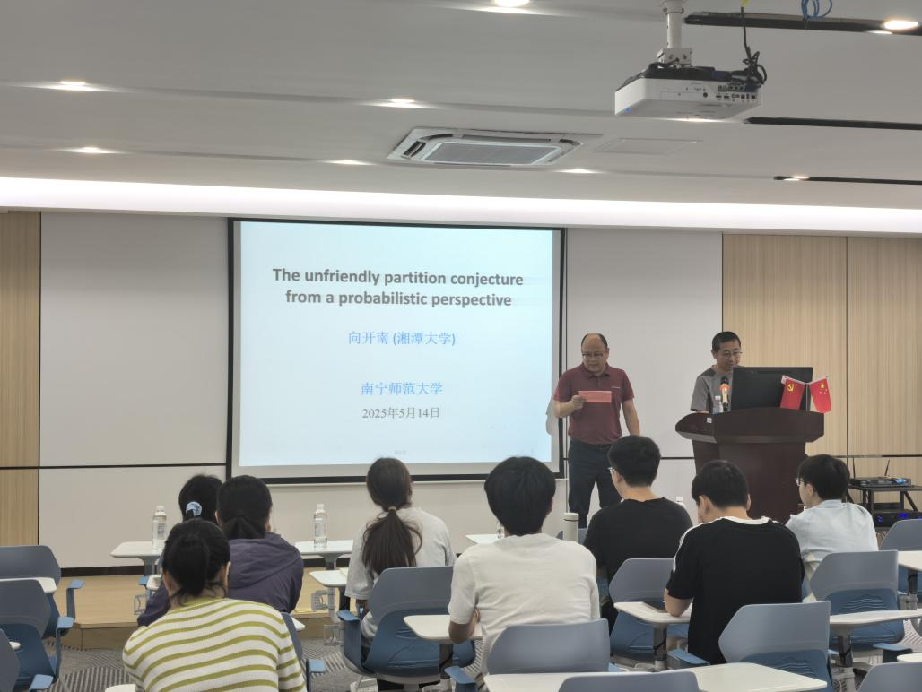 5月14日,应广西应用数学中心(KY开元集团官网)的邀请,湘潭大学向开南教授为数学与统计学院师生作了题为“概率论视角下的不友好剖分猜想”的学术报告。报告会由中心主任黄在堂教授主持。