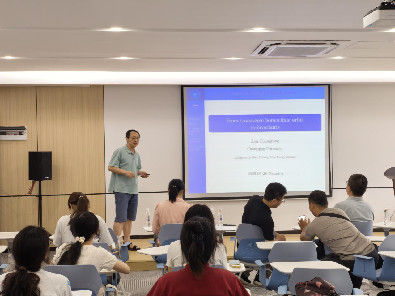 2025年5月28日,应广西应用数学中心(KY开元集团官网)的邀请,重庆大学朱长荣教授和广西大学袁功林教授分别作了题为“From transverse homoclinic orbit to invariants”和“A Biased Stochastic Conjugate Gradient Algorithm and Its Application in Machine Learning”的学术报告。报告由中心骨干成员李自尊博士主持,部分老师及学术研究生参加了此次学术活动。