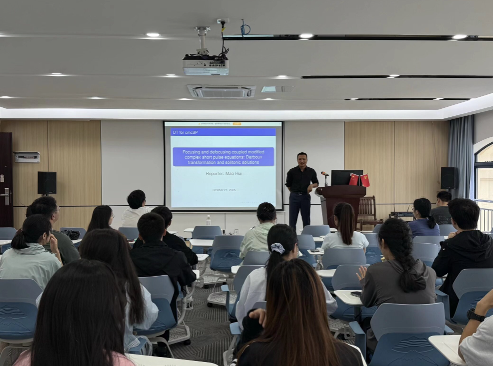 报告伊始,毛辉副教授以清晰的逻辑框架,深入浅出地阐述了耦合修正复短脉冲方程领域的最新研究动态与前沿进展,为在场师生搭建起理解该学术方向的基础认知。随后,他依托深厚的数学理论功底与独特的研究视角,系统运用互易变换、达布变换两大经典且高效的数学工具,逐步推导并呈现出该方程的一系列精确解—— 不仅涵盖基础孤子解、双峰孤子解、呼吸子解,更包含具有特殊物理意义的怪波解。复杂方程在数学工具的拆解下变得条理清晰,各类解的结构特性与形态差异直观呈现,充分展现了数学学科的严谨之美与科学探索的独特魅力,引发在场师生的深度思考。