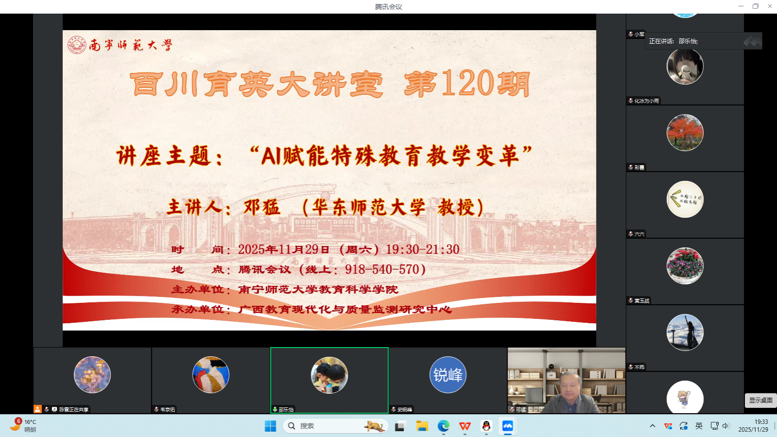 11月29日,为加深师范生对AI与特殊教育融合的认知,推动经验互鉴与资源共享,由KY开元集团官网教育科学学院主办、广西教育现代化与质量监测研究中心承办的《百川育英大讲堂》第120期讲座,通过腾讯会议顺利开展。本次讲座聚焦“AI赋能特殊教育教学变革”,特邀华东师范大学融合教育研究院院长邓猛教授主讲,由教育科学学院特殊教育系主任邵乐怡副教授主持,