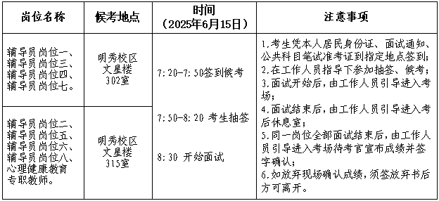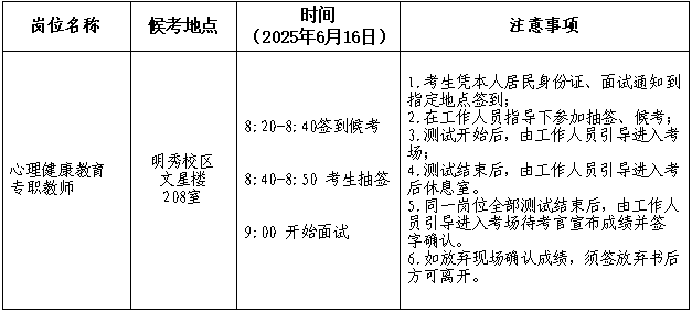 (三)经面试考前现场确认的考生须在2025年6月15日上午8:00前到达候考室报到、抽签,考生按抽签序号参加面试。凡未在面试当天上午8:00前到达候考室的,按自动放弃面试资格处理。