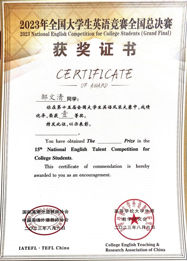 其中,来自亚欧语言文化学院的邹文清同学获英语演讲比赛二等奖1项、第十五届全国大学生英语风采大赛一等奖2项;开云官网朱悦杨同学获英语演讲比赛三等奖1项、英语辩论赛三等奖1项;国际商学院方霞同学获英语演讲赛二等奖1项。