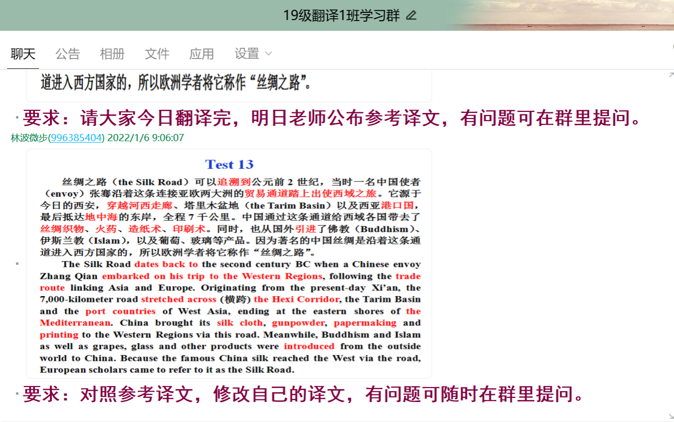 乃瑞华老师对《陪同口译》课程进行线上辅导,要求学生1.早上起来听英语音频,做英汉口译;2.听习近平主席新年贺词,做汉英视译,并且总结主席讲话中重要的汉英表达。