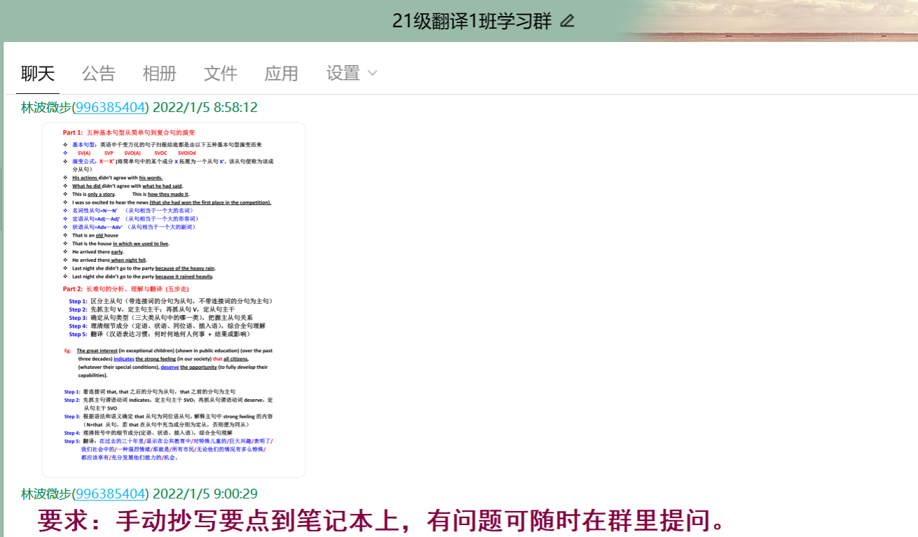 何运华老师每日给19级学生安排笔译练习,要求学生保持手感,学生在翻译过程可随时向老师提问,老师一一解答。此外,何运华老师每日给21级文法班的学生讲解句型演变以及长难句的理解、分析与翻译等,让大一同学打好基础。