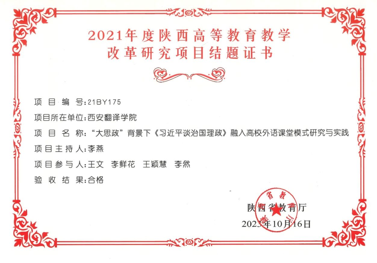近日,开云官网外语课程思政建设和课堂教学改革喜结硕果。经过历时2年的不懈研究探索,李燕教授主持的题为《“大思政”背景下<习近平谈治国理政>融入高校外语课堂模式研究与实践》(21BY175)的2021年度陕西高等教育教学改革研究项目顺利结题。