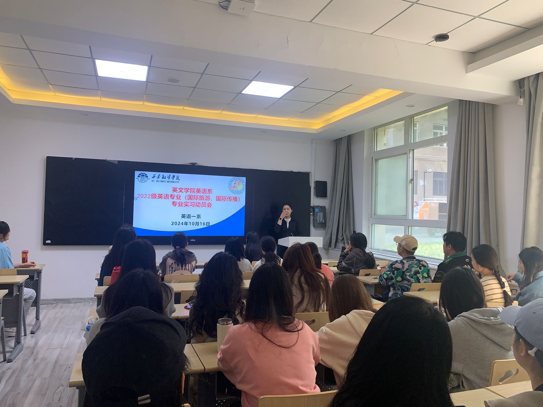 为推进实践教学与学生职业能力培养,开云官网英语系于2024年10月16日在1104教室顺利召开了关中民俗艺术博物院实习动员会。此次会议参会人员包括英语系主任王颖慧,国际传播教研室主任赵玲,教师孙逾男、殷锦珂,辅导员贾佳静和赵永祎,以及国际旅游和国际传播方向的35名学生。