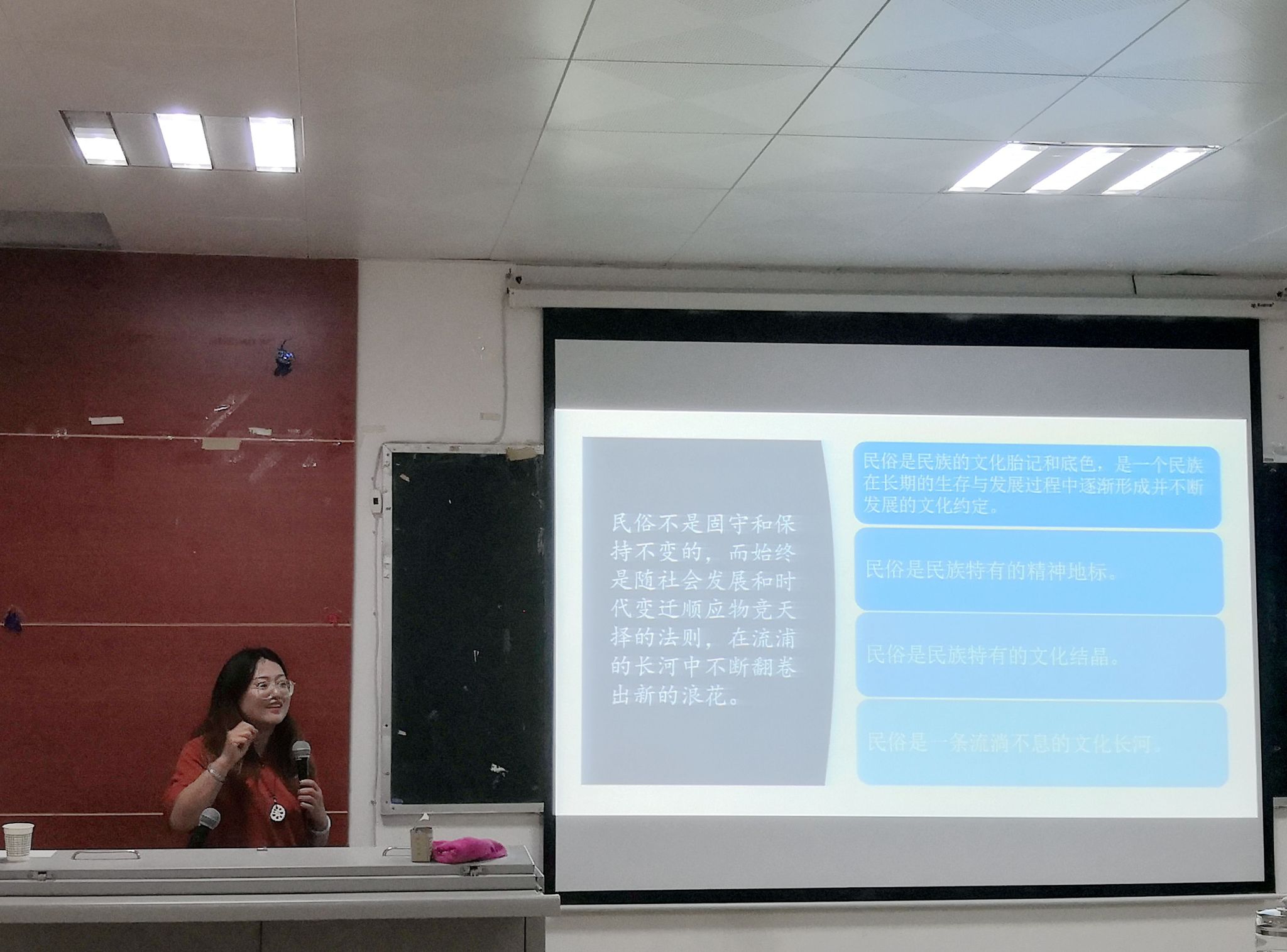 杨小慈老师从终南民俗源流和概念、终南民俗的发展特点以及终南民俗的内容三个方面介绍了终南民俗文化。她讲道,终南山有一种独特的地理位置,成就了独特的终南文化。终南民俗是把制度和民俗结合在一起,体现了集体无意识的特点。终南地区儒家文化薪火相传,传统的宗族观念影响深远,其中最具代表性的是九族制对亲属关系的界定以及丧服制中的“五服”概念。讲座现场气氛活跃,师生们无不感慨终南民俗文化的博大精深及其对世界文化、中华文化产生的重要影响。大家对婚俗文化产生了浓厚兴趣,并进行了热烈讨论。