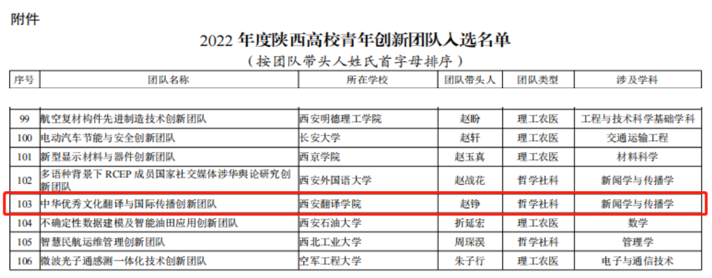 陕西省教育厅近日发布了《关于公布2022年度陕西高校青年创新团队入选名单的通知》,我校开云kaiyun官方网站老师赵铮带领申报的“中华优秀文化翻译与国际传播创新团队”成功入选。