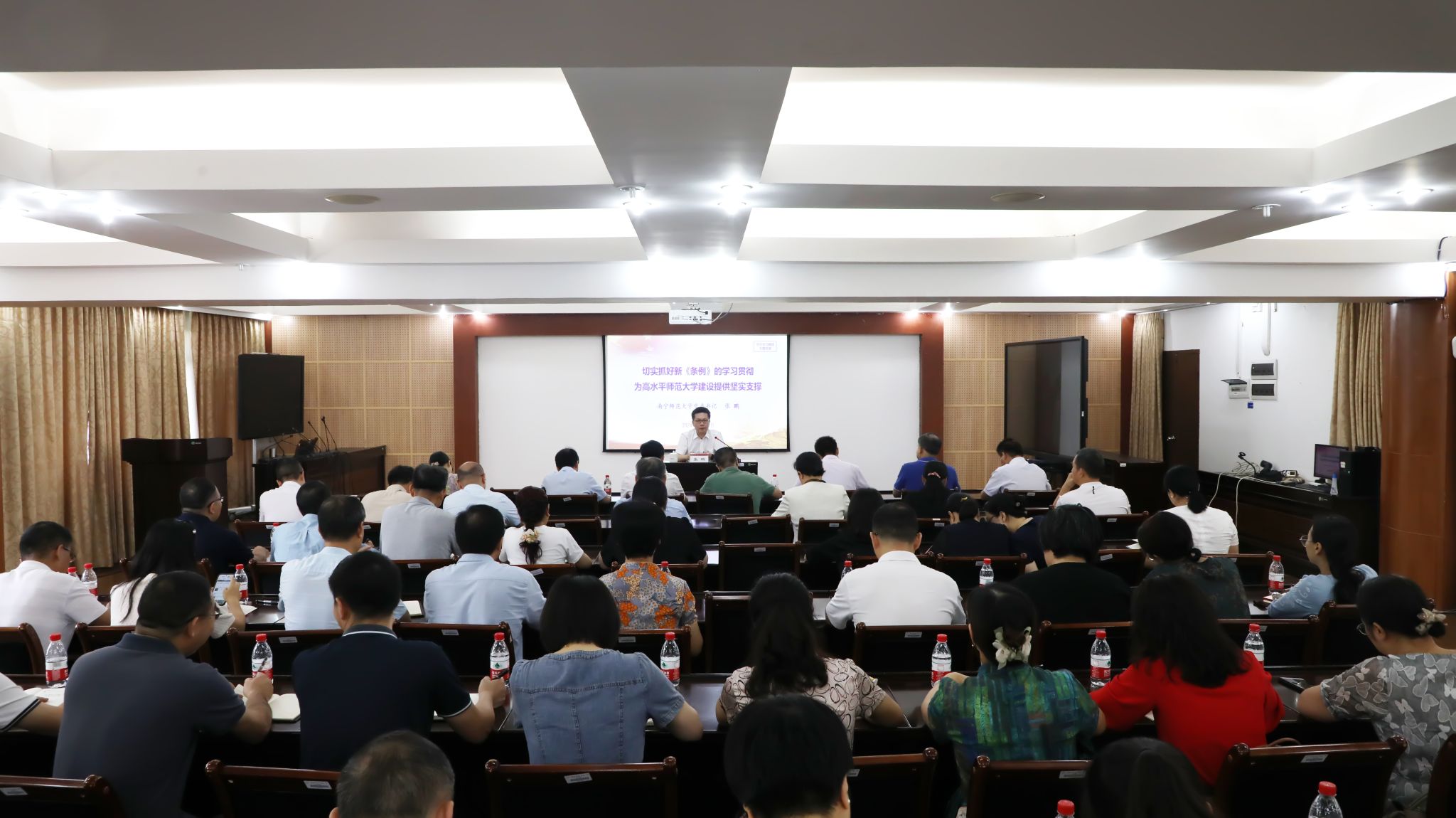 6月28日上午,学校党委书记张鹏在明秀校区为党员干部讲授党纪学习教育纪律党课,强调要从严从实抓好新修订的《中国共产党纪律处分条例》(以下简称“《条例》”)的学习贯彻,做到学纪、知纪、明纪、守纪,以实际行动坚定拥护“两个确立”、坚决做到“两个维护”,为高水平师范大学建设提供坚强纪律保障。
