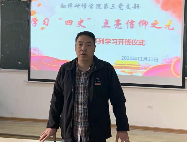 为深入开展“四史”学习教育及新冠肺炎疫情防控系列活动,持续激发师生爱党爱国爱社会主义的巨大热情,进一步增强道路自信、理论自信、制度自信、文化自信,翻译研修学院第三党支部举办了学习“四史”点亮信仰之光系列活动学习班。11月11日,学习班开班仪式及第一次学习活动顺利展开。翻译研修学院党委副书记蒋小军出席开班仪式,翻译研修学院第三党支部书记陈晓楠主持活动。