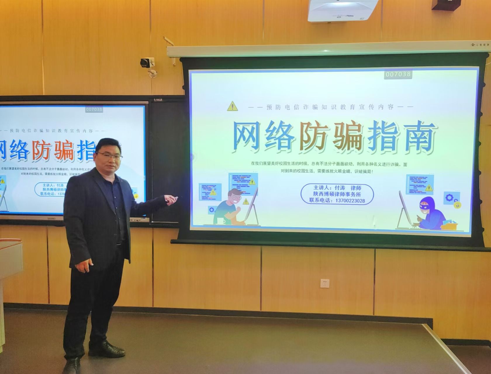 随后,一场精彩纷呈的讲座在4211T举行。讲座伊始,徐忆红老师介绍与会嘉宾,并对张博科长和付涛律师的到来表示欢迎。王颖慧主任介绍了本次讲座的主题,她着重强调了预防电信诈骗的重要性,并鼓励学生们珍惜这次宝贵的学习机会。讲座中,付涛律师结合近年来发生在高校的真实电信诈骗案例,通过生动形象的语言和图文并茂的 PPT 展示,深入浅出地向同学们剖析了电信诈骗的常见手段和作案方式,让学生们对各类电信诈骗手段有了更直观的认识,并提高了其防范意识。同时,付涛律师向同学们详细介绍了法律援助的申请条件、流程和服务范围,让师生们了解到法律援助是保障社会公平正义的重要制度,是群众维护自身合法权益的有力武器。最后,在互动问答环节,学生们积极参与,现场气氛热烈。