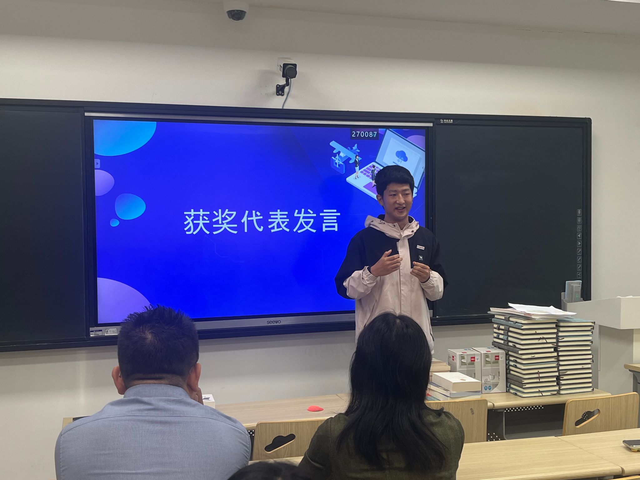 为了更好地激励同学们利用好蓝思阅读来提升自己阅读能力,同时也为了表彰在过去一年里在蓝思阅读上取得优异成绩的同学们,此次奖励从蓝思值、总分以及蓝思值提升值这3个维度进行奖励,一等奖3名;二等奖3名;三等奖3名以及优秀奖21名同学。会上李佳一作为代表发言,李同学首先对学校为同学们提供的专业学习平台表示感谢,随后分享了使用蓝思阅读软件的心得以及自己的进步与成长。