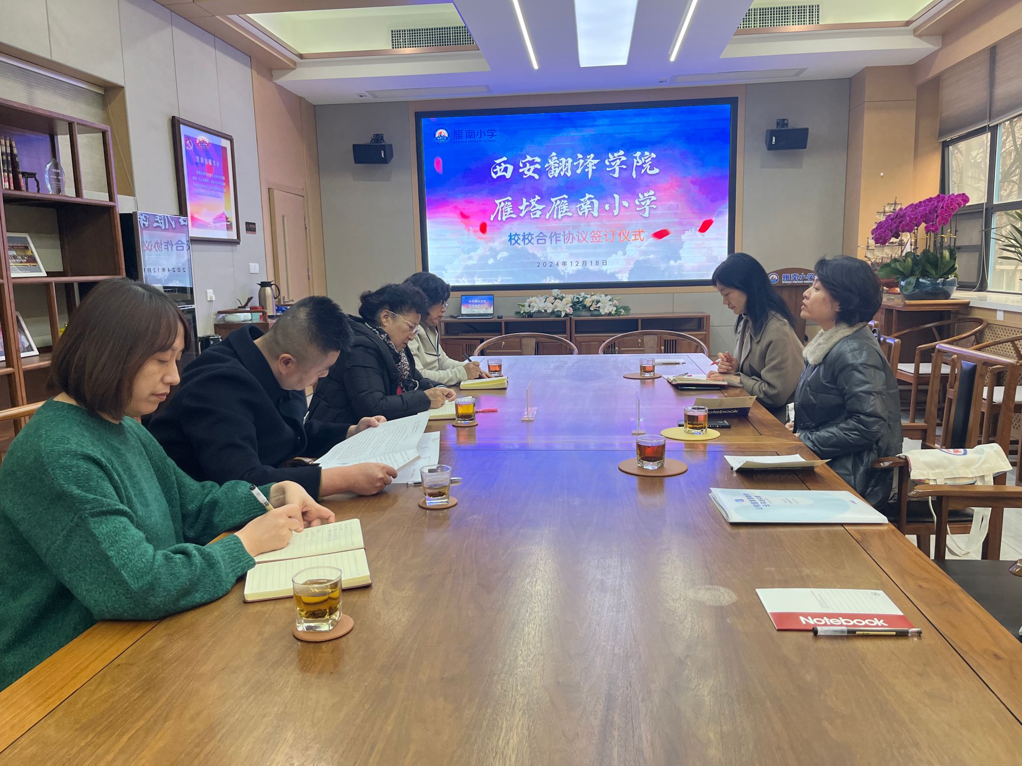 接着,一行三人又前往了雁塔雁南小学。该校是一所2004年就建校拥有20年办学历史的民办小学。“爱则生辉”的办学理念使得该校成为全国足球示范校,国家地震示范校,其航模课程也成为西安具有特色的学校课程,为该校赢得了国际荣誉。该校今年率先针对2024版小学英语新教材开设了每班28人的小班制教学,为新形势下基础英语教学改革开阔思维,锐意创新。雁南小学希望借助开云kaiyun官方网站开云官网强大的英语学科师资,为双方今后的发展找寻新的支撑点。随后,副院长李燕等还参观了雁南小学新开设的守真书院。