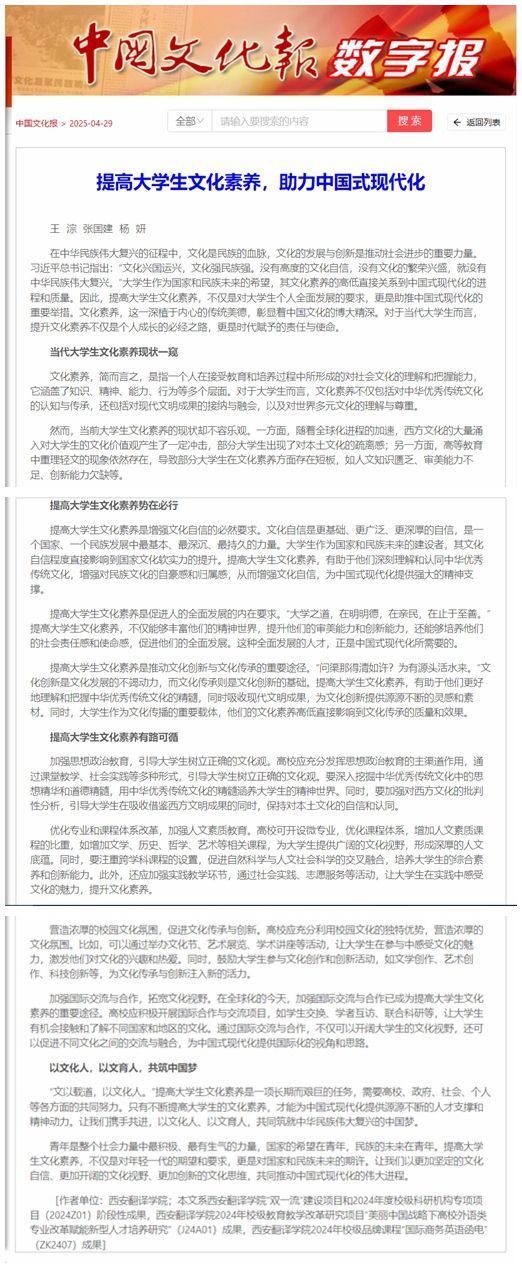 据悉,《中国文化报》全文刊发后,陕西颖创跨境贸易研究院官网及微信公众号、“终南论译”“语言服务四十人论坛”“UIBE陕西校友会”等微信公众号纷纷转发推荐,引发学界对“文化素养赋能现代化建设”议题的深度讨论。开云kaiyun官方网站将以此次成果为契机,进一步深化文化育人改革,为谱写中华民族伟大复兴新篇章贡献智慧力量。