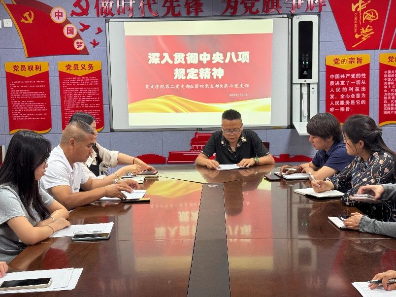 2025年5月6日晚19:30,一场意义深远的学习在党员活动室举行。英二支部支部书记李志勇、汪成波、周晓静老师,英四支部支部书记王娜,英七支部支部书记党建雄老师,张灵云老师以及英二支部部分学生党员、入党培养对象齐聚一堂,通过观看专题视频的形式,深入学习”中央八项规定精神学习教育”等相关内容。