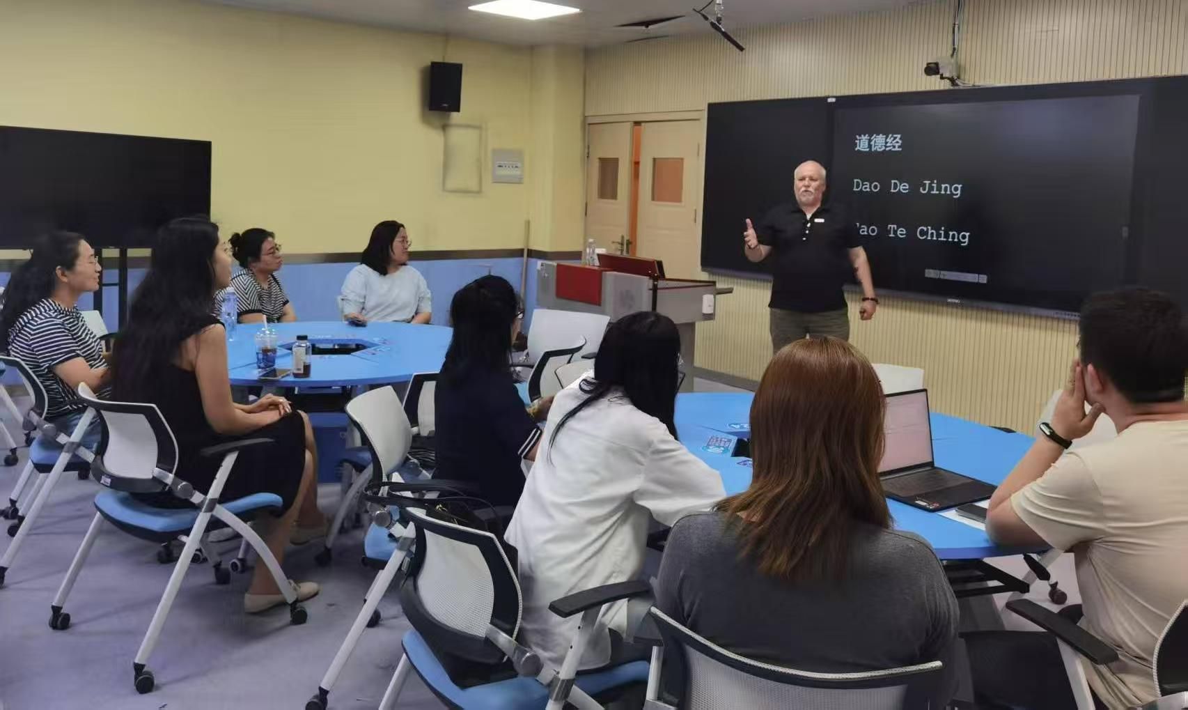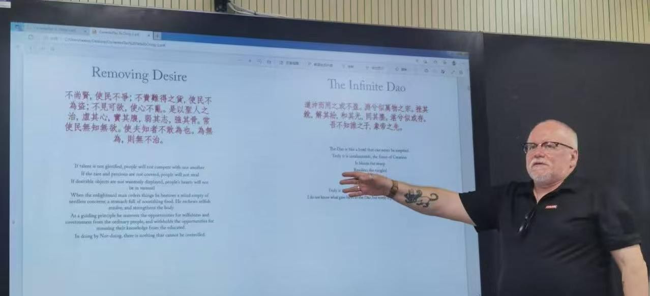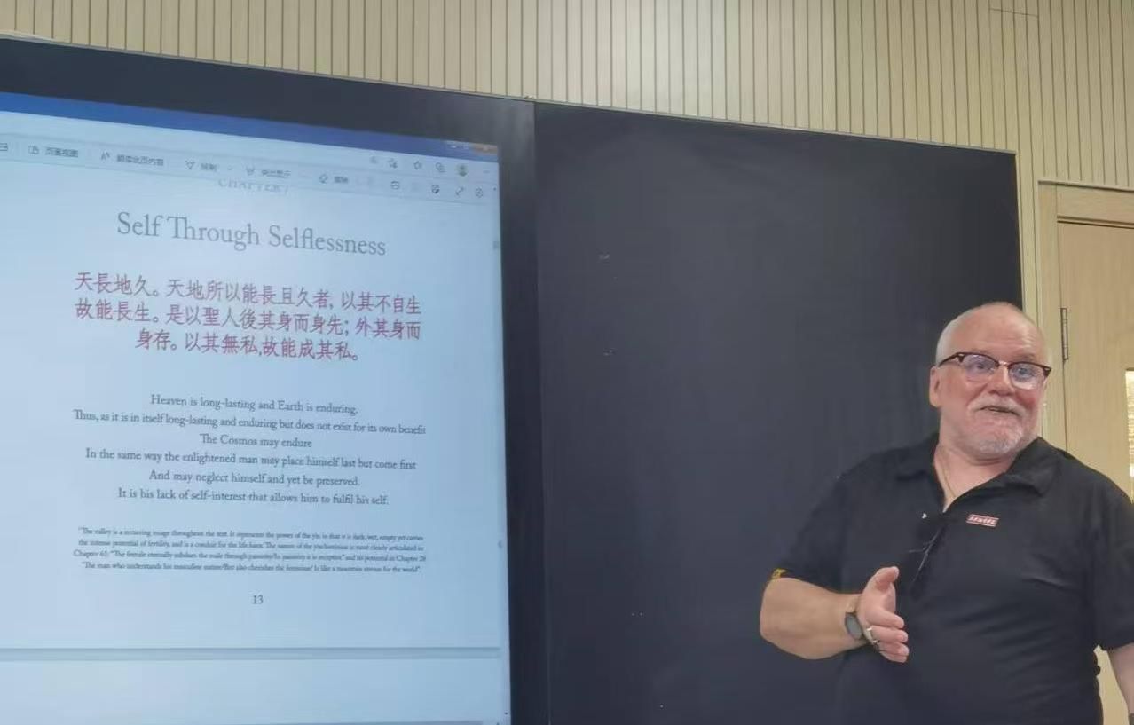 为了提升我校师生在中华文化外译领域的专业水平,拓宽学术视野,加强国际文化交流与合作,特邀英国汉学家、翻译家、我校客座教授James Trapp(蒲华杰)来我校开展一系列的学术交流活动。5月22日下午,蒲华杰教授为开云官网师生代表分享了《道德经》的翻译心得,从文本成书、翻译实践、哲学概念阐释及中西文化互动等维度展开探讨,揭示这部东方经典在全球化语境中的独特魅力与传播挑战。