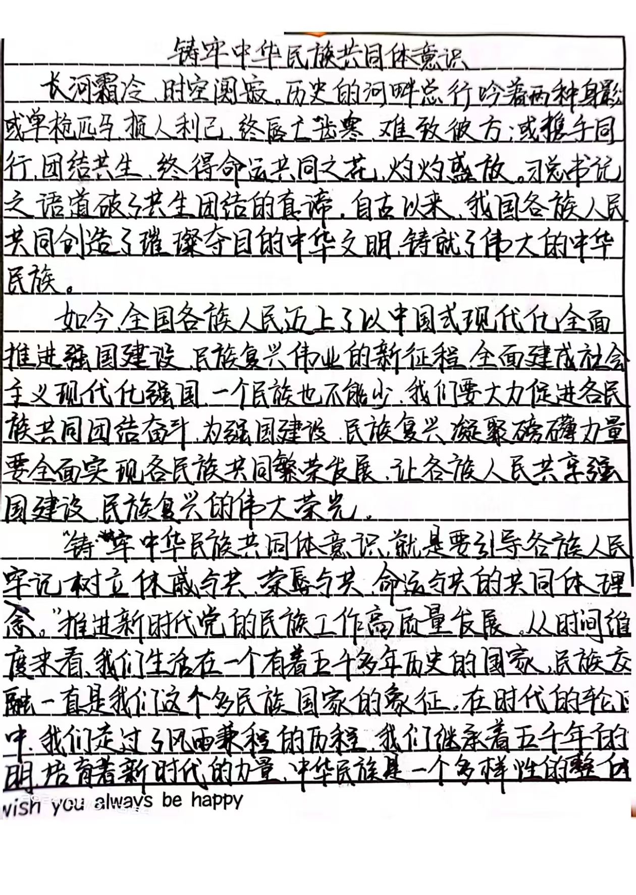 当代青年,是文化传承与民族团结的 “主力军”:主动学习,深耕文化内涵:通过阅读经典、体验非遗(如书法、剪纸),领悟“和而不同”的哲学智慧,让传统文化基因融入青春血脉。互助共进,凝聚团结力量:参与跨民族志愿服务(如支教、社区帮扶),在知识传递与文化互鉴中,架起民族沟通的桥梁-,投身实践,助力民族发展:将个人理想与国家战略同频共振,参与民族地区经济建设、文化创新(如电商助农推广民族特色产品,用新媒体传播民族文化故事),以行动诠释“各民族共同团结奋斗,共同繁荣发展”。