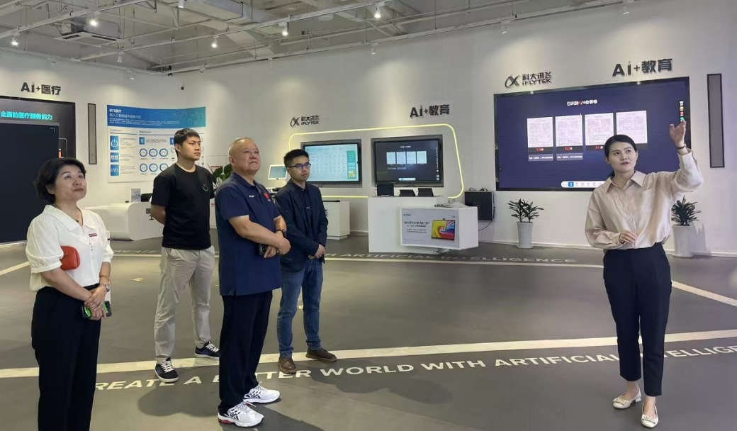 在科大讯飞工作人员的引导下,调研团队重点参观了人工智能创新展馆。通过“智慧教育”展区的AI学习机智能系统,教师们现场体验了人工智能在作文自动评分、发音纠错、多语言翻译等语言学习场景中的精准应用;调研团队观看了讯飞星火大模型演示,对人工智能技术的发展潜力与应用前景表示高度认可。在“智慧医疗”展区,多语言交互随访系统展现了人工智能技术在跨语言服务中的突破性进展。