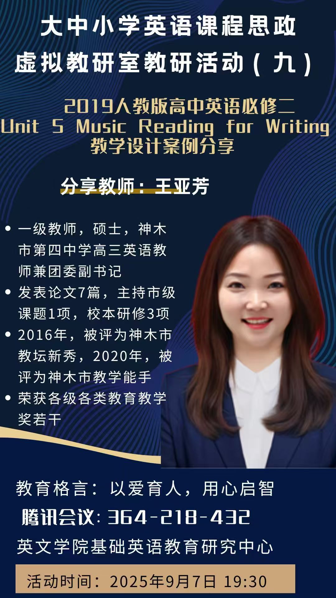 在教学展示环节,陕西省神木市第四中学一级教师王亚芳以人教版高中英语必修二Unit 5 Music “Reading for Writing”为课例,呈现了一节融合语言学习、文化育人与技术应用的示范课。王老师以音乐为主线,通过任务驱动引导学生开展多层次文本分析,从词汇理解、修辞手法到情感共鸣,逐步推进深度学习。在输出环节,学生通过撰写演讲语篇实现语言内化与迁移运用,并在评价反馈中提升写作能力与批判思维。