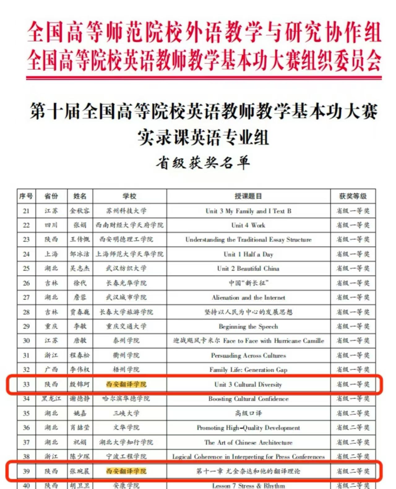 10月26日,在刚刚落幕的“2025年第十届全国高等院校英语教师教学基本功大赛”上,我院英语系及翻译系共七名教师,在四个赛道众多优秀参评作品中荣获八项大奖,创造了我院在此赛事中的最佳成绩。赛前,学院领导高度重视参赛工作,提前部署备赛方案,组织多轮培训与集中研讨,教师竞赛团队通力协作、精心打磨参赛作品,为本次优异成绩奠定了坚实基础。在微课组优秀课例评比中,莫丽娅、晁玉朦教师团队、申雅洁老师均荣获全国三等奖;在实录课英语专业组中,殷锦珂老师、张琬晨老师分别荣获省级一等奖、省级二等奖;在说课组比赛中,张益迎老师、姜春兰老师分别荣获省级一等奖、省级二等奖;在优秀学术论文评选中,姜春兰老师的两篇学术论文分别荣获一等奖、二等奖。