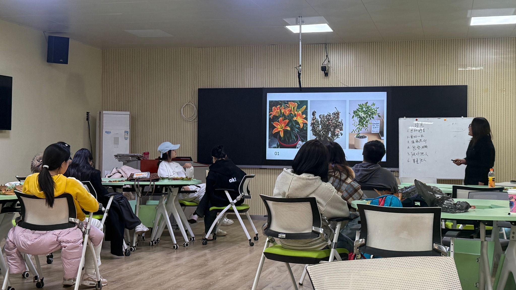 活动伊始,“初见与树叶”破冰环节温情开启。参与同学依次复述前一位成员的姓名、班级及专业,再分享自身选择手中树叶的缘由,以自然之物为纽带打破陌生隔阂,快速建立彼此间的信任与连接,为活动顺利推进铺垫温暖氛围。随后进入“三盆花中的自我隐喻”环节,谢晓欣老师以三盆花为具象比喻,引导大家从优点、不足、改进方向三个维度深度审视自我,在自我剖析与思考中明晰成长定位,开启内在自我对话与成长探索之路。