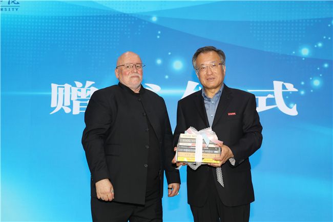 英国翻译家James Trapp向西译赠书并受聘西译客座教授。崔智林代表我校接受赠书。