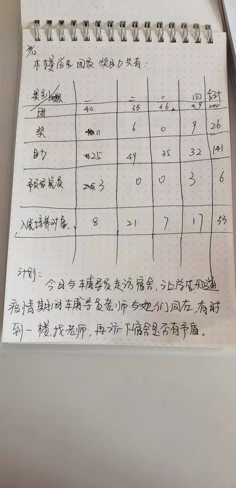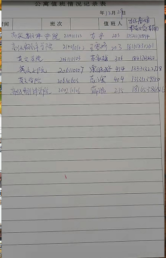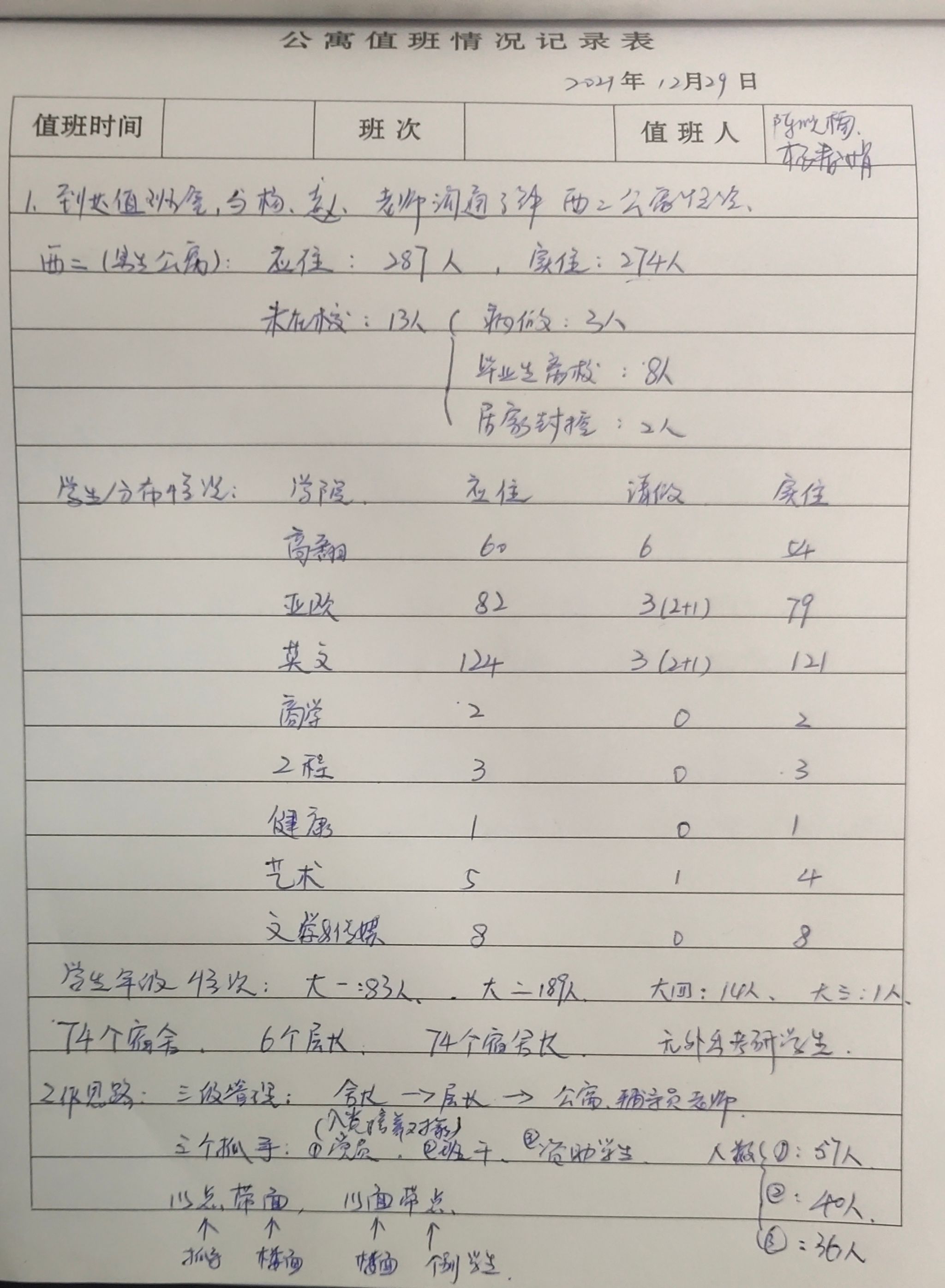 西二公寓目前学生住宿274人,分别由高翻院60名学生、英文院121名学生、亚欧院79名学生主要组成 ,商学院、工程院、健康院、艺术、文传院有少数学生组成。西五公寓共计276人,主要由英文院137名学生、高翻院84名学生及文传、亚欧等少数学生组成,两栋公寓值班辅导员杨春娟、陈晓楠、魏婧、袁铭雪分别对整栋楼学生进行分组,建立了以社长、层长、辅导员老师和公寓老师构成的三级管理体制,结合本公寓的情况,按照入党培养对象、班级委员、受各类奖助学金构成了三类学生为工作抓手,建立了微信群,逐步形成了“以点带面,以面带点,特殊关注,重点帮扶”的工作思想,同时与公寓管理老师同心协力,建立了工作交流群。