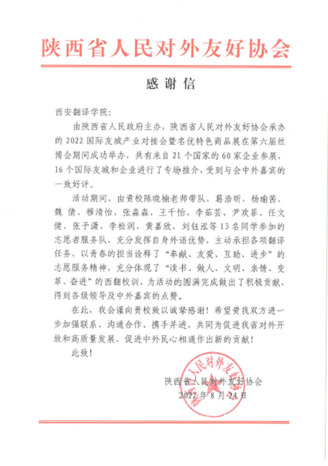 活动结束后,我校师生受到与会嘉宾和陕西省人民对外友好协会的高度赞扬与评价,同时给学校发来感谢信,并在信中表达了希望双方进一步加强合作与联系,共同为陕西省对外开放和高质量发展、促进中外民心相通做出新的贡献。