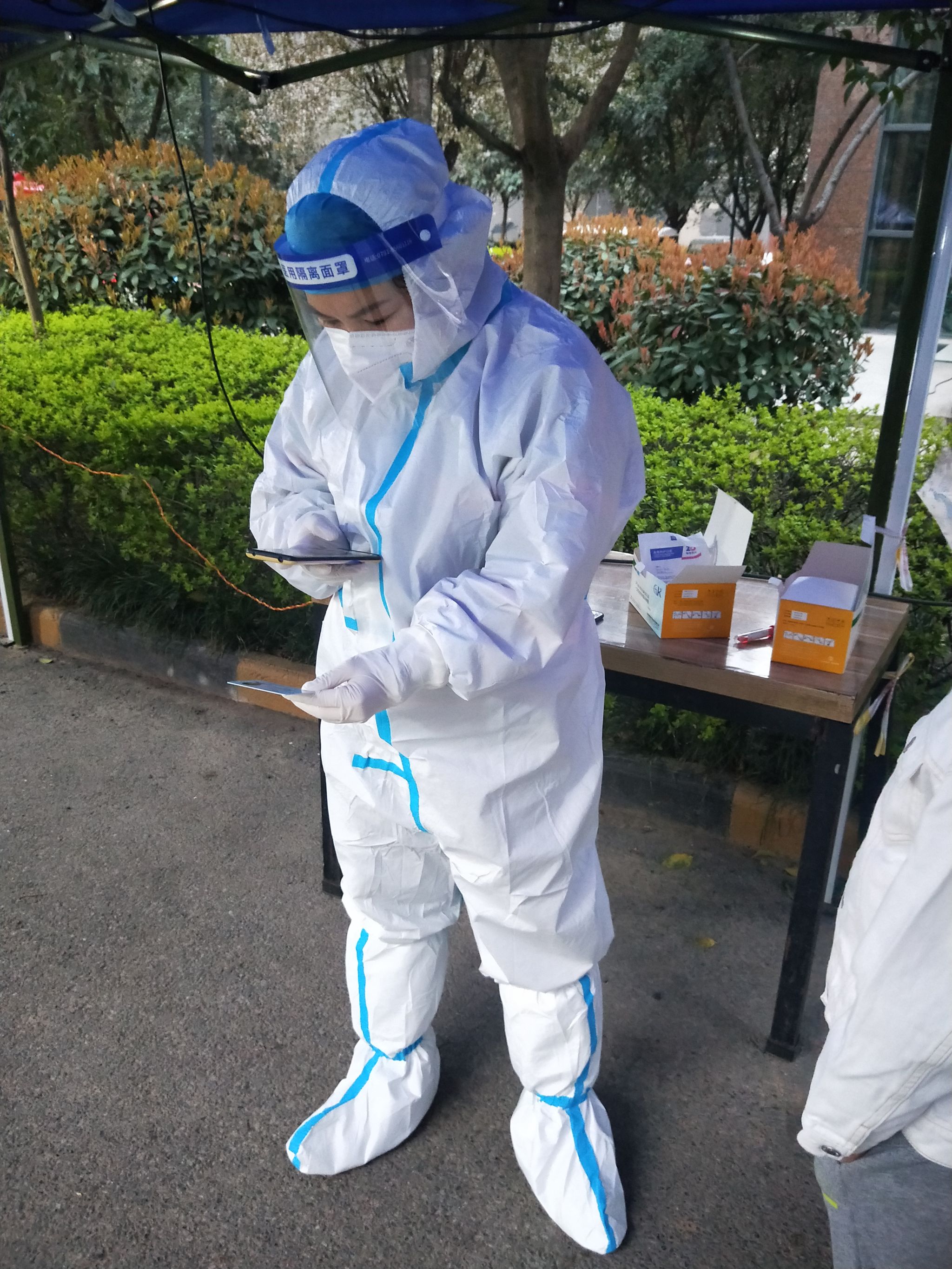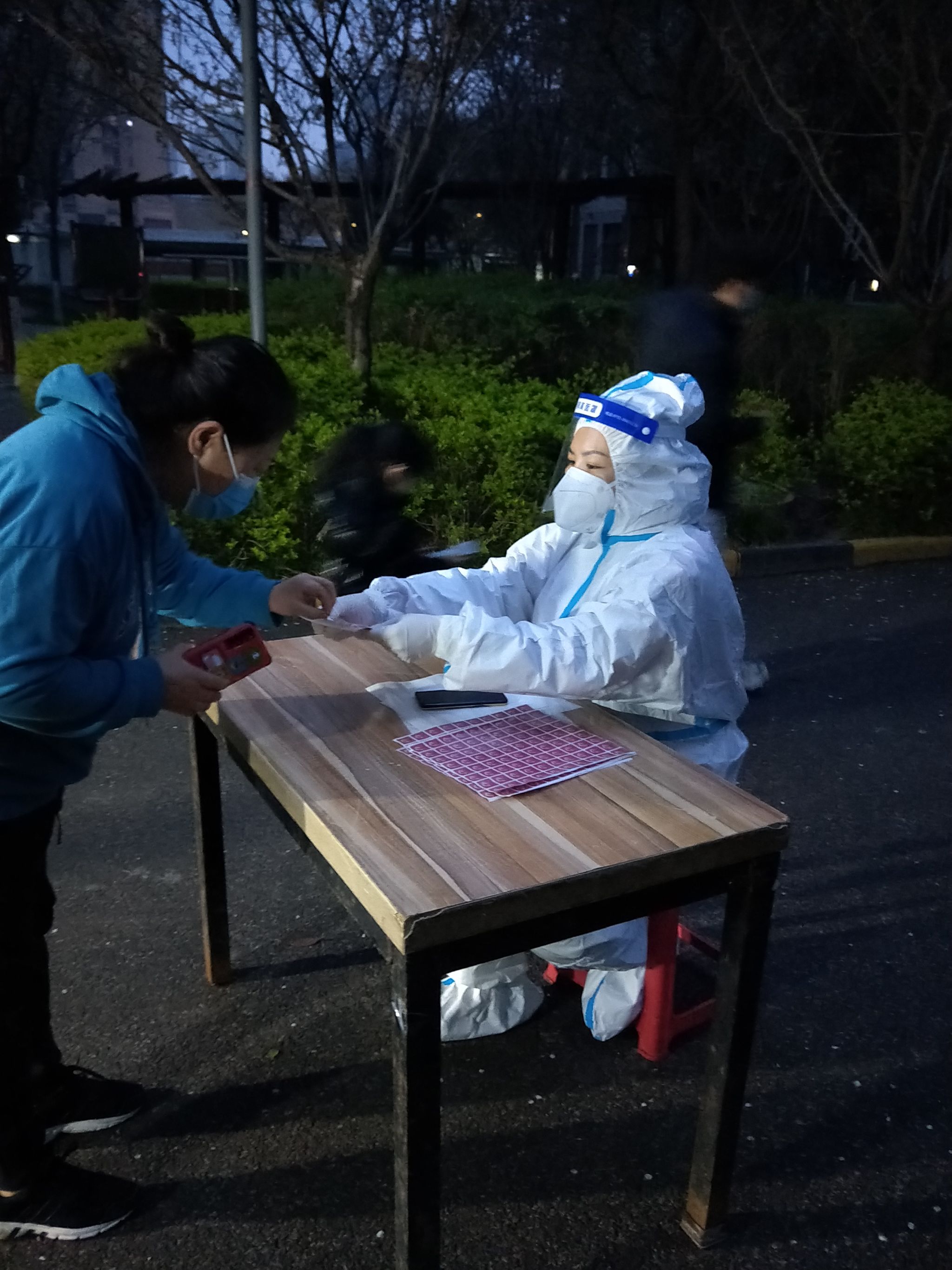 担任志愿者的这几天,张芳老师每天凌晨4点起床,4:40到达物业防疫办公室,换好隔离服,戴好口罩、面罩、手套,5点准时“出摊”,组织小区居民进行核酸检测。