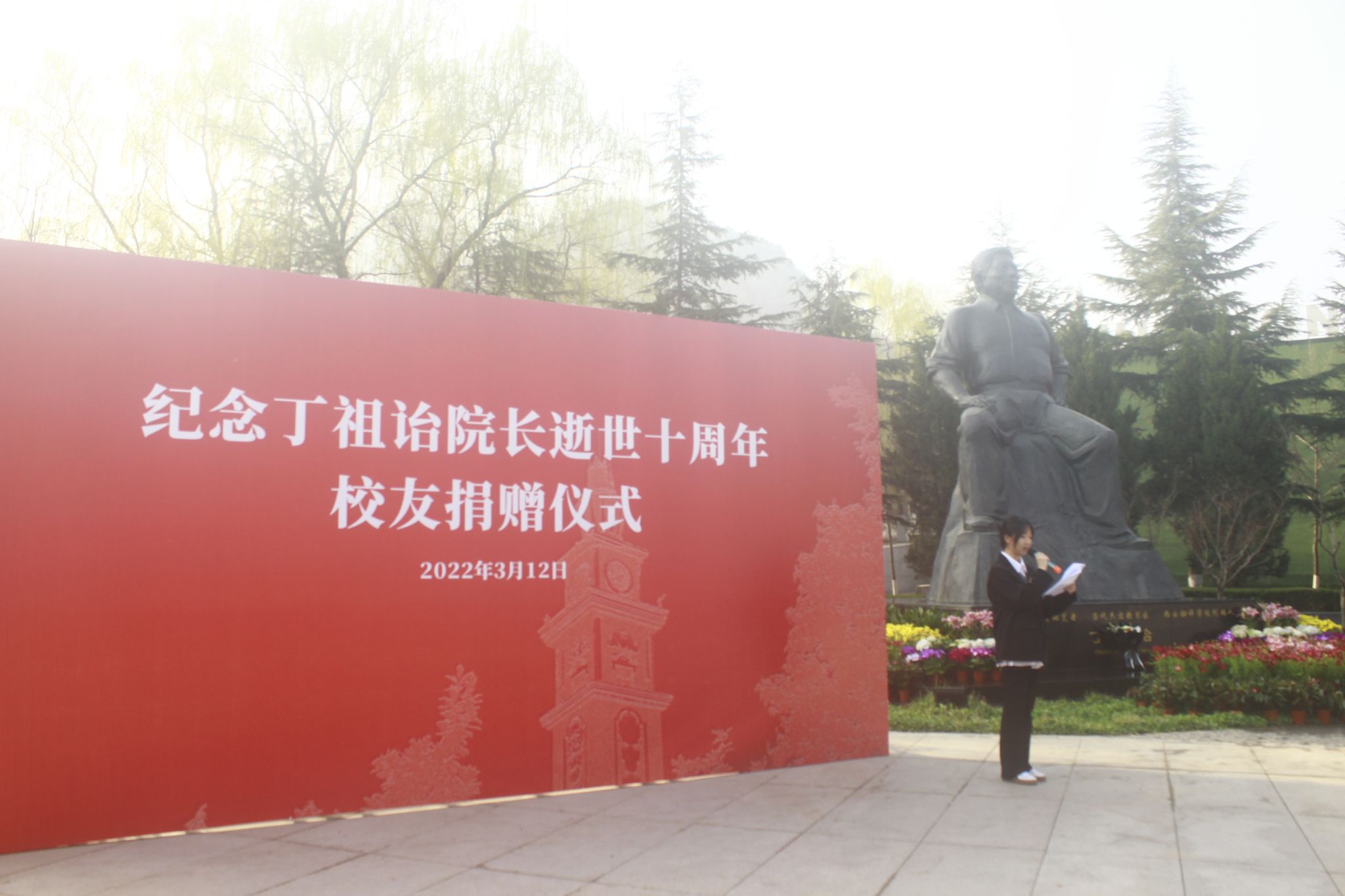 2022年3月11日早9点整,开云kaiyun官方网站师生代表在学校八号楼诒华广场举行纪念追思活动,在丁祖诒老院长的铜像前,深切缅怀老院长,表达怀念、追思与景仰之情。开云kaiyun官方网站院长袁小陆,行政副院长蒋小军,教学副院长张睿,科研副院长张莹,综合办主任简实,部分教师代表及学生社团干部代表参与此次活动,大一学生李家豪担任主持。