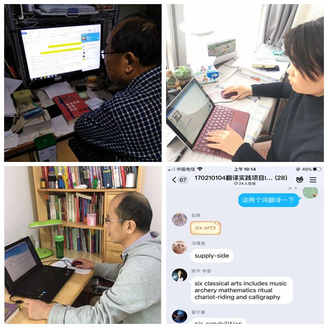 根据课程教学要求,翻译研修学院师生本阶段的学习主要选用中国大学MOOC、智慧树,学银在线等公共学习平台的MOOC课程资源,进行线上视频教学,以学习通、QQ课程学习群等形式进行线上辅导、答疑。对于以实操、实训为主的课程,如翻译实践项目、计算机辅助翻译等通过国家虚拟仿真实验教学项目共享平台(实验空间)、EduCoder在线实践教学平台开展线上虚拟仿真实训教学,或使用电脑将实训项目操作录屏后,以录播形式进行线上教学,通过学习通、QQ课程学习群等形式进行线上辅导。同时,翻译研修学院要求本院教师要强化责任意识,在疫情防控期间,各专业课教师做好课程思政,实时关注并收集双语疫情防控信息,并作为课堂输入材料,师生共同学习,确保疫情防控和教育教学两不误。